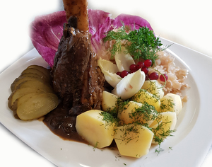 Roladka z karkówki z nadzieniem zrazowym w sosie ciemnym podana z ziemniakami puree i kapustą zasmażaną na ciepło. Waga dania 450 g (substancje alergiczne 1,3,7)